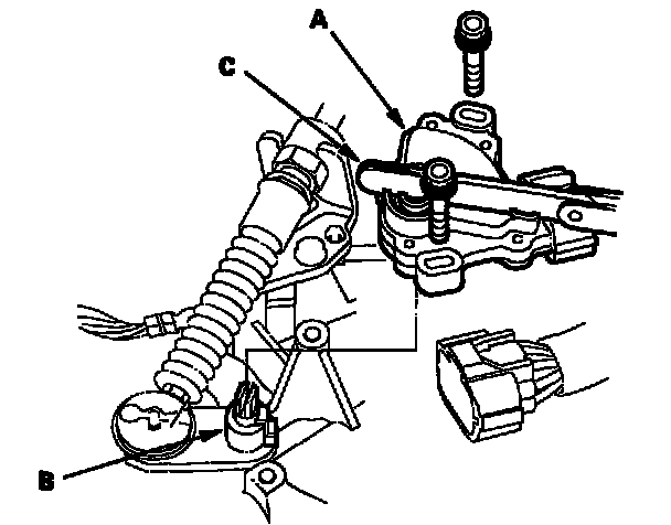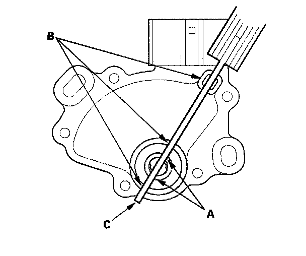 7. Align the cutouts (A) on the rotary-frame with the neutral positioning cutouts (B) on the transmission range switch, then put a 2.0 mm (0.08 inch) feeler gauge blade (C) in the cutouts to hold it in the N Position.