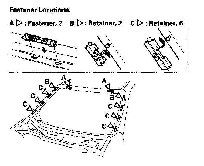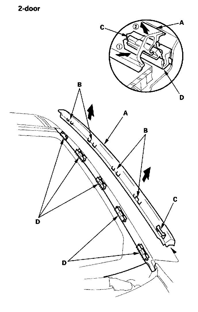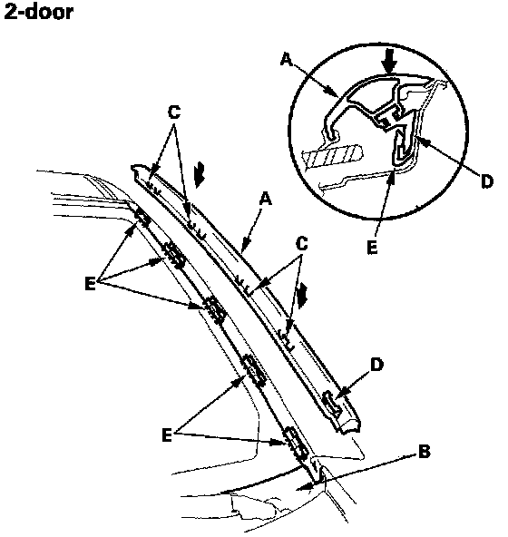 26. 2-door: Install the clip (A) on both side moldings (B). If the clip portions (C) of the molding are damaged, replace the molding.