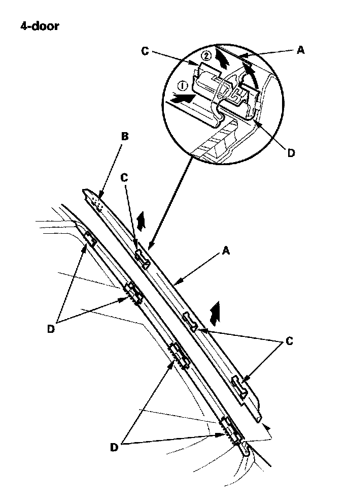 1. Pull up the side trim (A) to release the clips (B, C) from the retainers (D), then remove the trim from each side of the windshield.