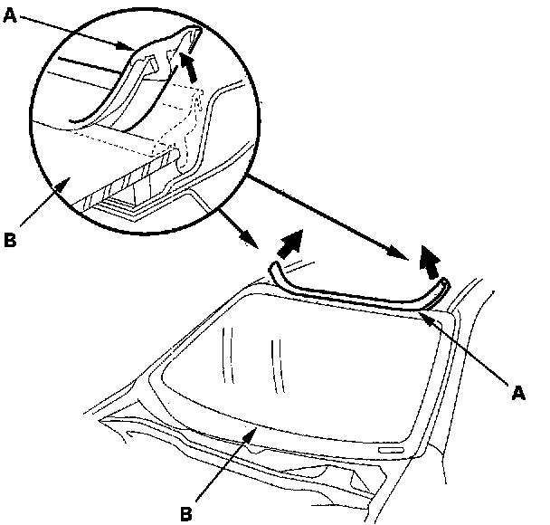 3. Remove the molding (A) from the upper edge of the windshield (B). If necessary, cut the molding with a utility knife.