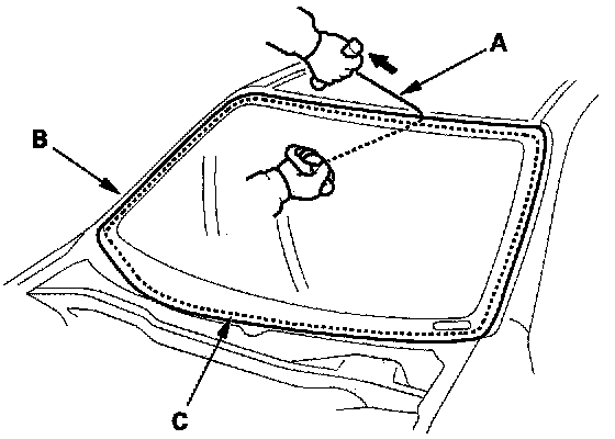 7. With a helper on the outside, pull the piano wire (A) back and forth in a sawing motion. Hold the piano wire as close to the windshield (B) as possible to prevent damage to the body and dashboard. Carefully cut through the rubber dam and adhesive (C) around the entire windshield.