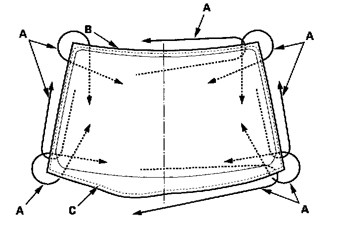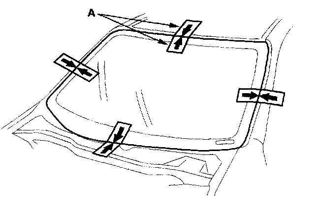 16. Set the windshield in the opening, and center it. Make alignment marks (A) across the windshield and body with a grease pencil at the four points shown. Be careful not to touch the windshield where adhesive will be applied.