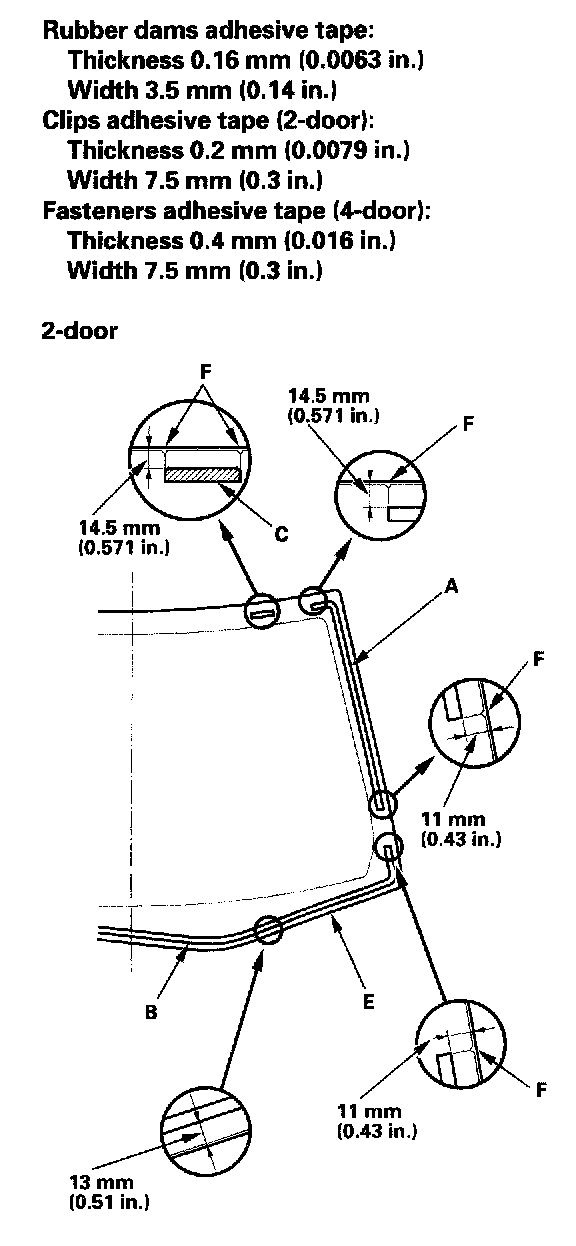 12. Attach the side rubber dams (A) and lower rubber dam (B) with adhesive tape. 2-door: Attach the clips (C) with adhesive tape. 4-door: Attach the fasteners (D) with adhesive tape to the inside face of the windshield (E) as shown:
