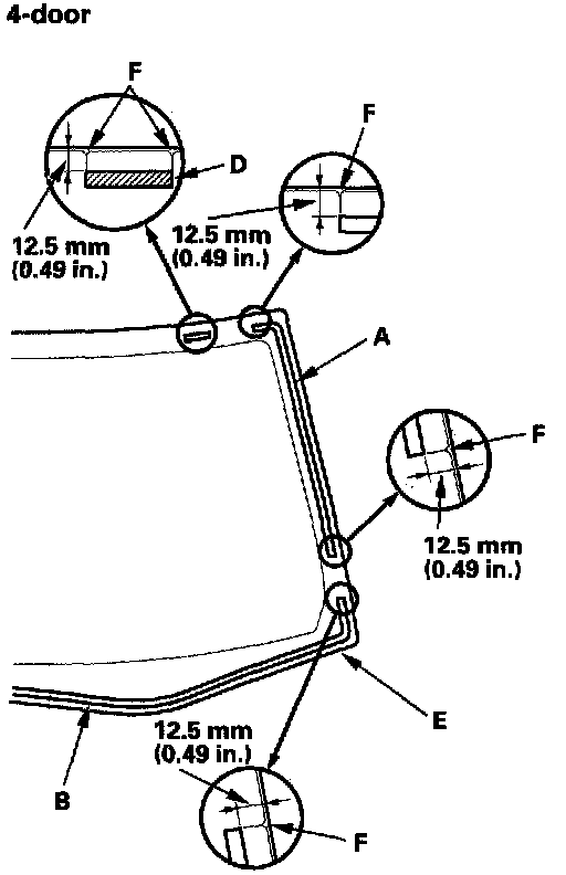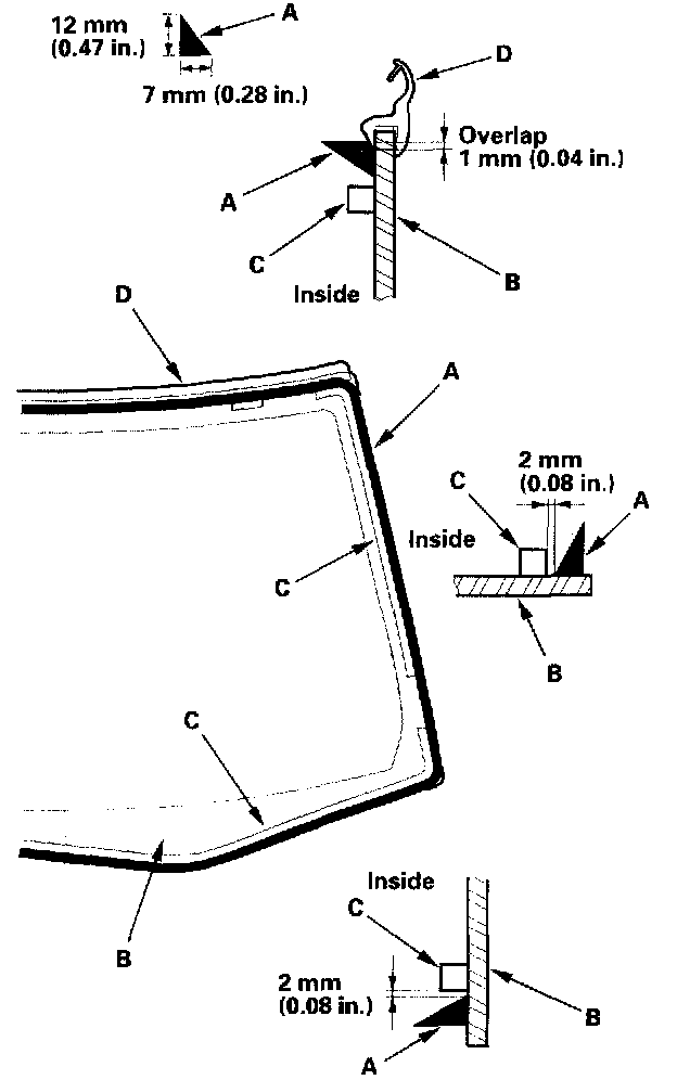 21. Put the cartridge in a caulking gun, and run a bead of adhesive (A) around the edge of the windshield (B) between the dams (C) and molding (D) as shown. Apply the adhesive within 30 minutes after applying the glass primer. Make a slightly thicker bead at each corner.