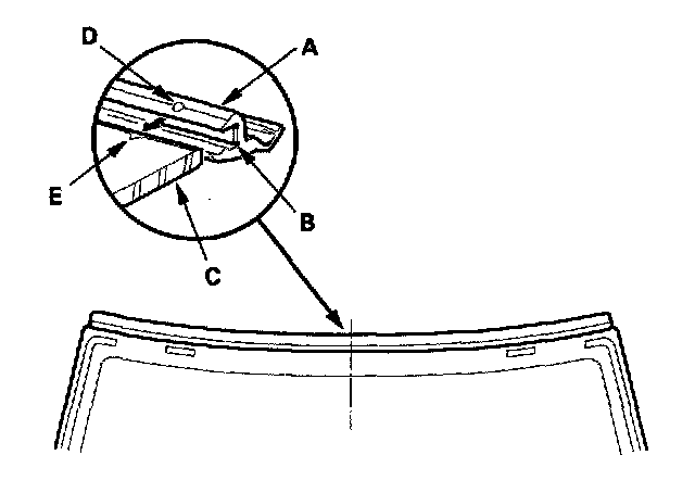 - Be sure the alignment mark (D) of the molding lines up with the alignment mark (E) of the windshield.