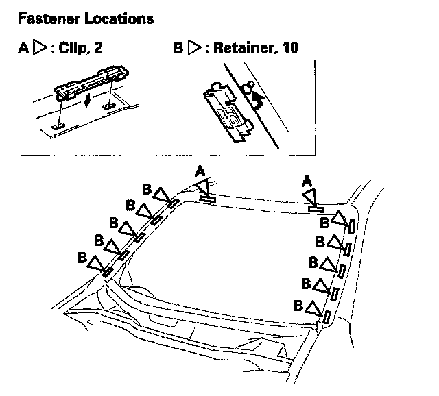 14. 2-door: Attach the clips (A) and retainers (B) to the body.