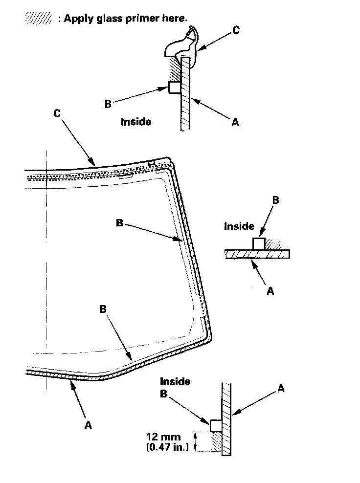 18. With a sponge, apply a light coat of glass primer around the edge of the windshield (A) between the dams (B) and molding (C) as shown, then lightly wipe it off with gauze or cheesecloth: