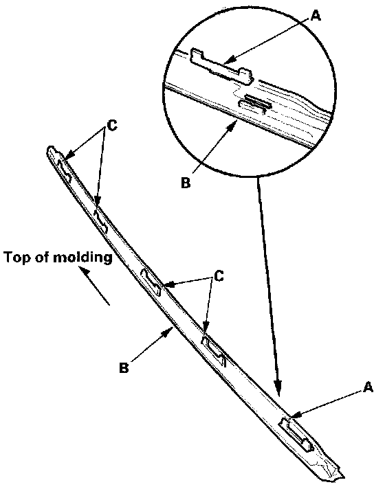 13. Attach the molding (A) with adhesive tape (B) to the upper edge of the windshield (C):