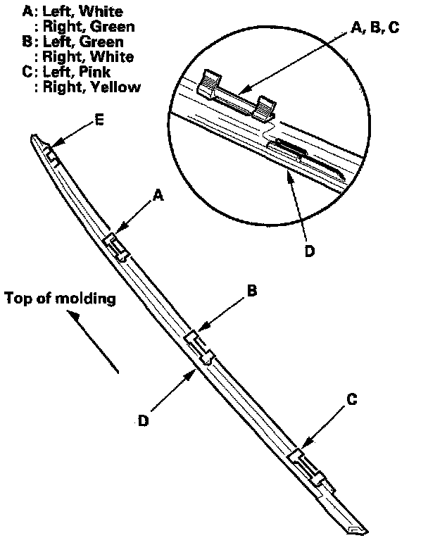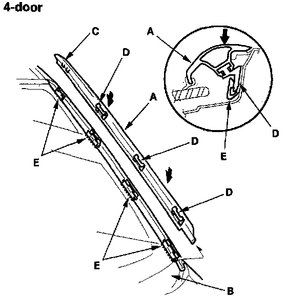27. 4-door: Install the clips(A, B, C) on both side moldings (D) If the clip (E) is damaged, replace the side molding and clip as an assembly.
