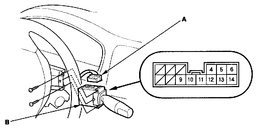 3. Disconnect the 14P connector (A) from the wiper/washer switch (B).