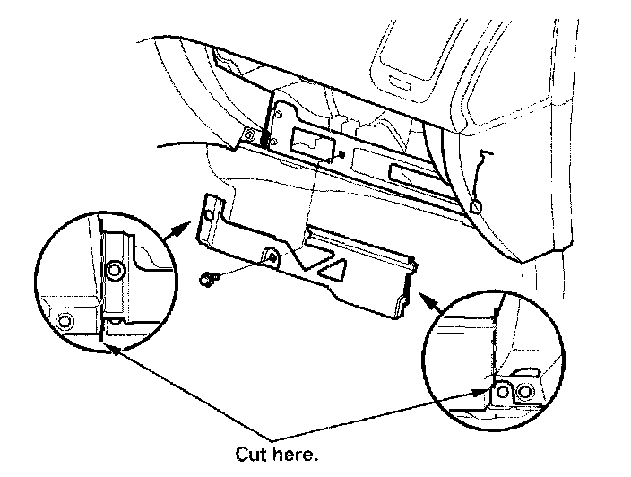 2. Remove the bolt. Cut the plastic cross brace in the glove box opening with diagonal cutters in the area shown, and discard it.