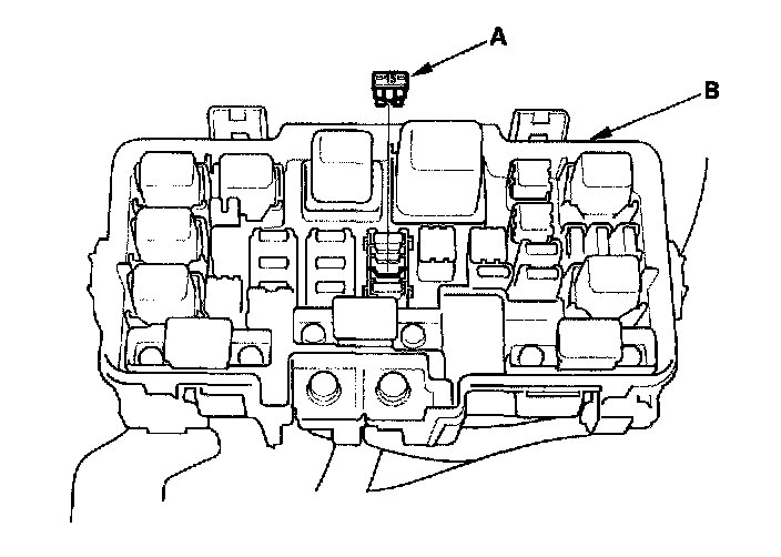 - Turn the ignition switch OFF, and remove the No.6 ECU (ECM/PCM) (15 A) fuse (A) from the under-hood fuse/relay box (B) for 10 seconds.