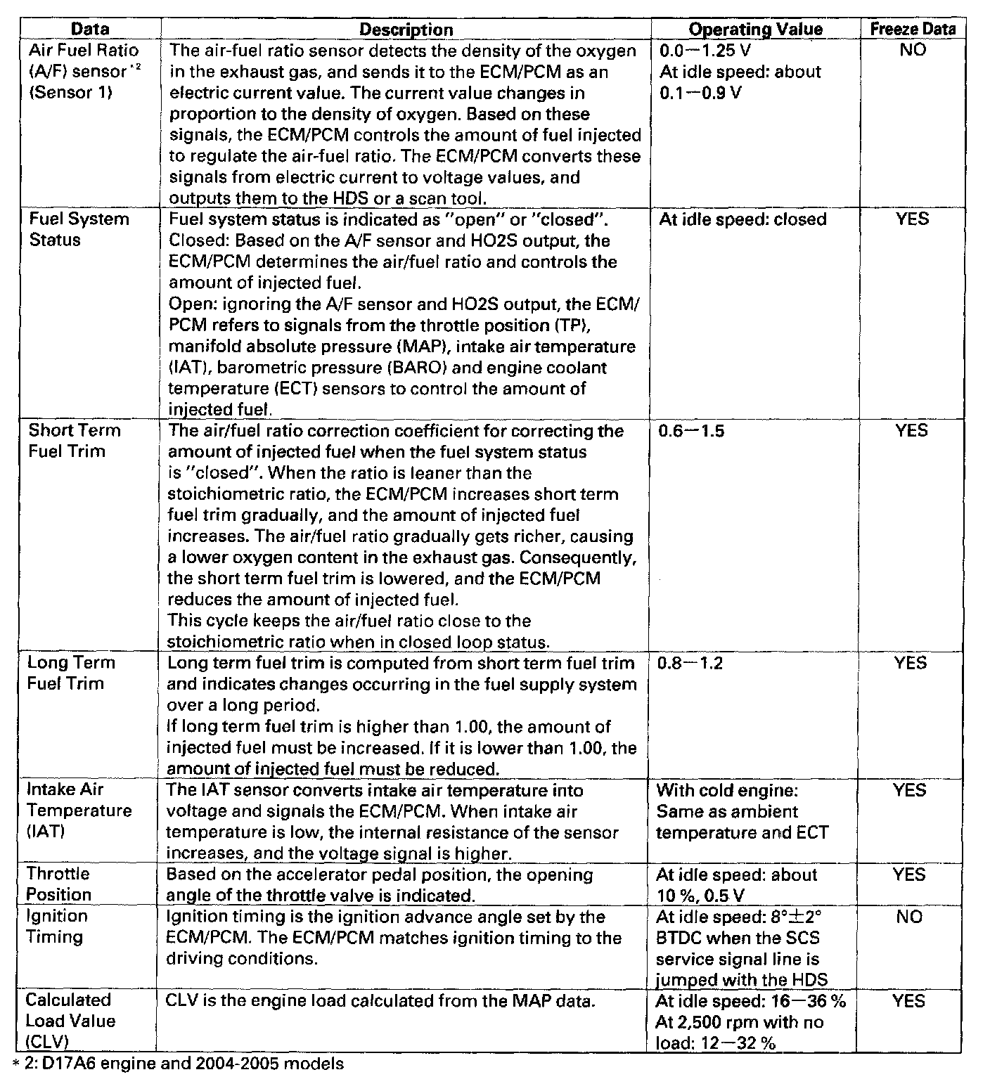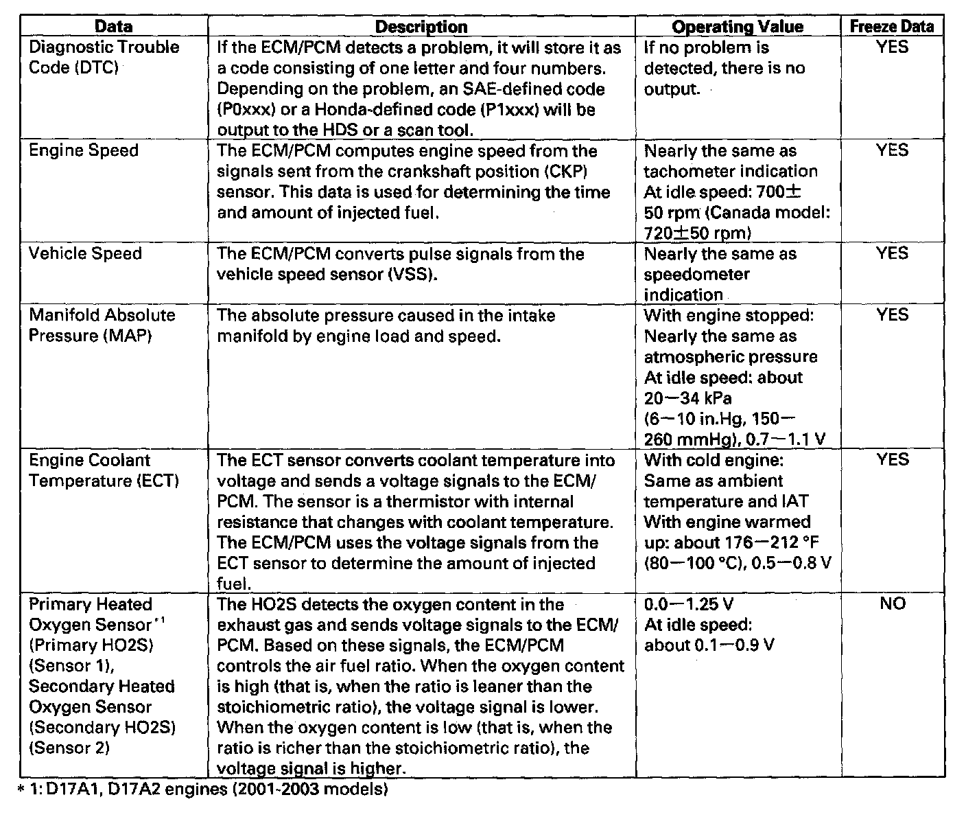 You can retrieve data from the ECM/PCM by connecting the HDS or a scan tool to the data link connector (DLC). The items listed in the table conform to SAE recommended practice. The HDS also reads data beyond that recommended by SAE to help you find the causes of intermittent problems.