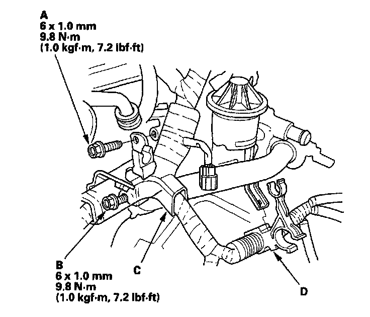 2. Remove the bolt (A) and loosen the bolt (B) securing the VTEC solenoid valve, then remove the harness bracket (C) from the VTEC solenoid valve.
