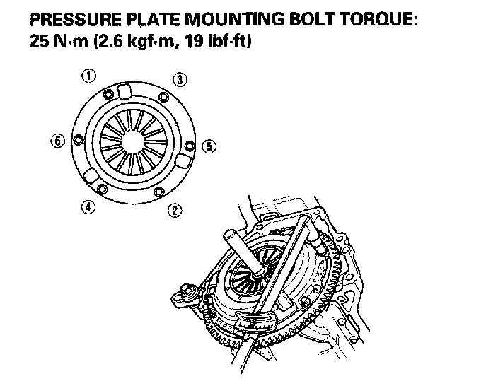 Pressure plate mounting bolts in a crisscross pattern. Tighten the bolts in several steps to prevent warping the diaphragm spring.
