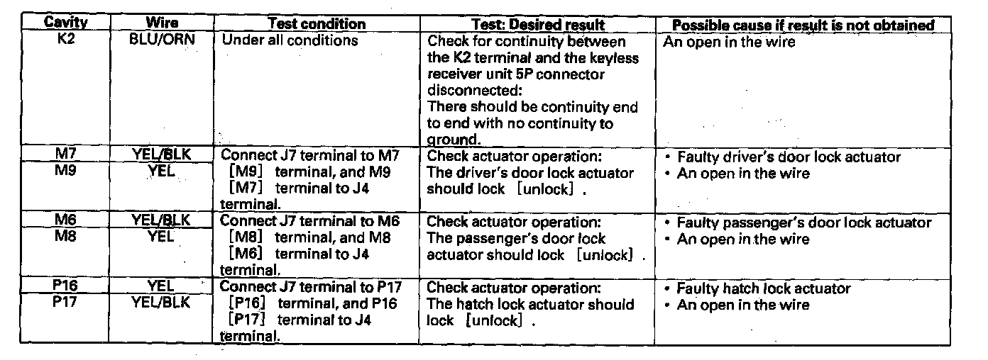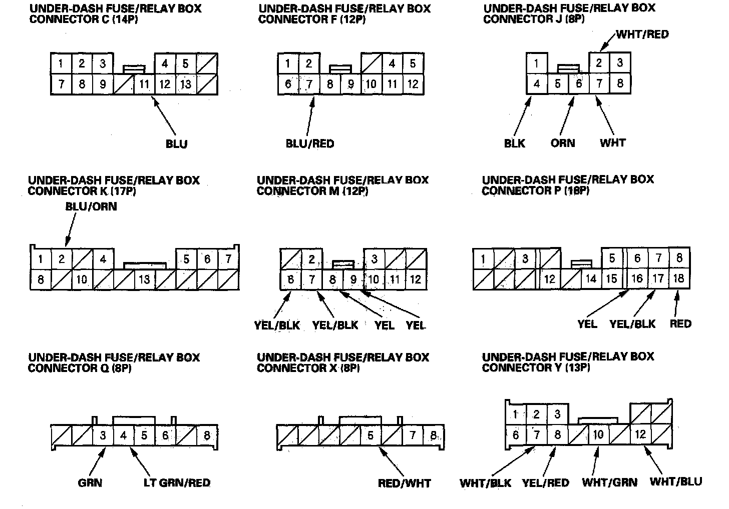 6. Disconnect the M, P, K and J connectors from the under-dash fuse/relay box, and make these input tests at the connector.