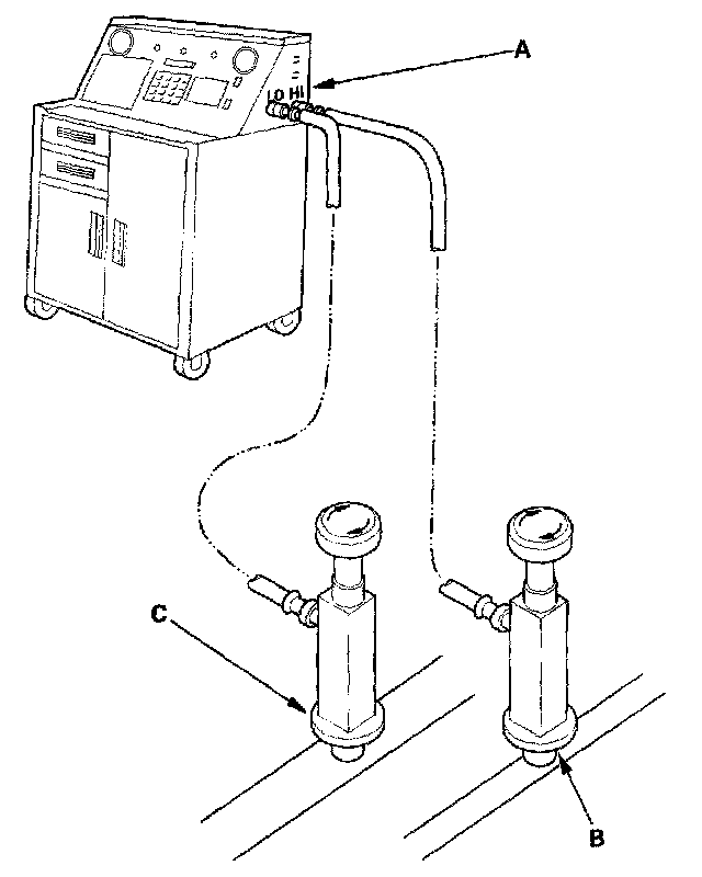 2. Connect an R-134a refrigerant recovery/recycling/charging station (A) to the high-pressure service port (B) and the low-pressure service port (C), as shown, following the equipment manufacturer's instructions. Evacuate the system.