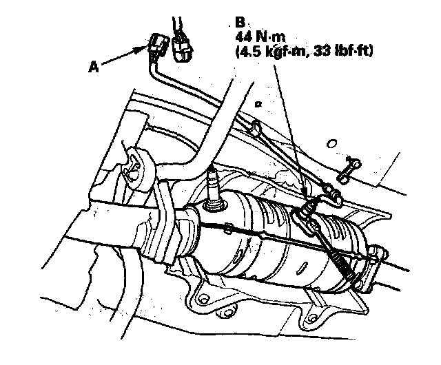 1. Disconnect the secondary HO2S 4P connector (A), then remove the secondary HO2S (B).