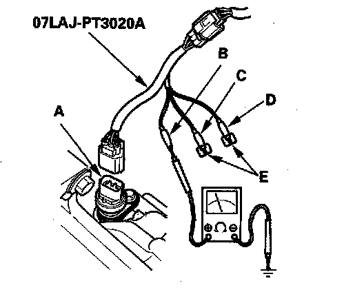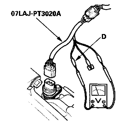 10. Connect the GRN test harness clip (D) to the positive probe of a voltmeter.