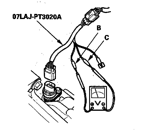 5. Connect the WHT test harness clip (B) to the positive probe of a voltmeter, and connect the RED test harness clip (C) to the negative probe.