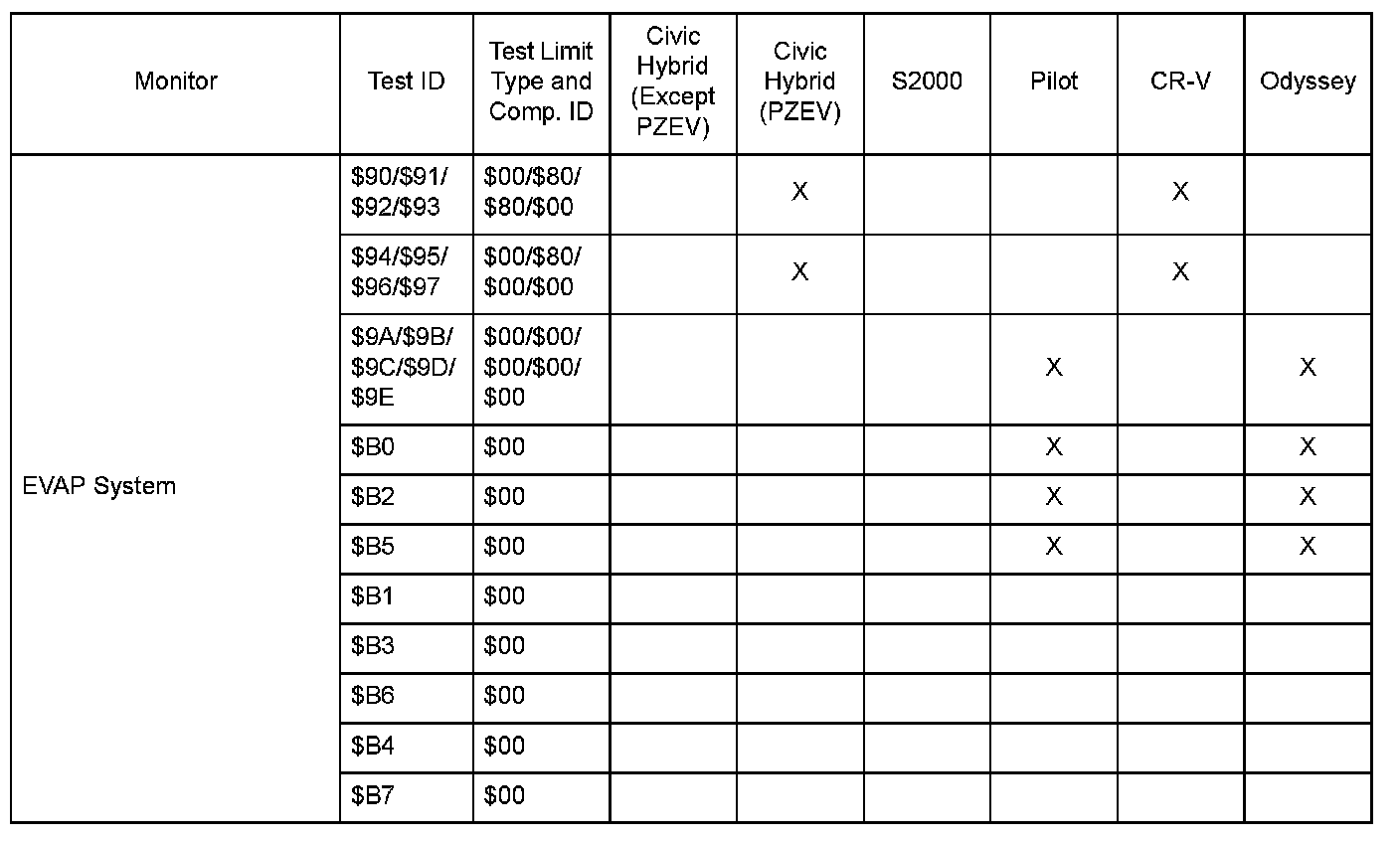 Mode $06 Test ID by Model: Group 2