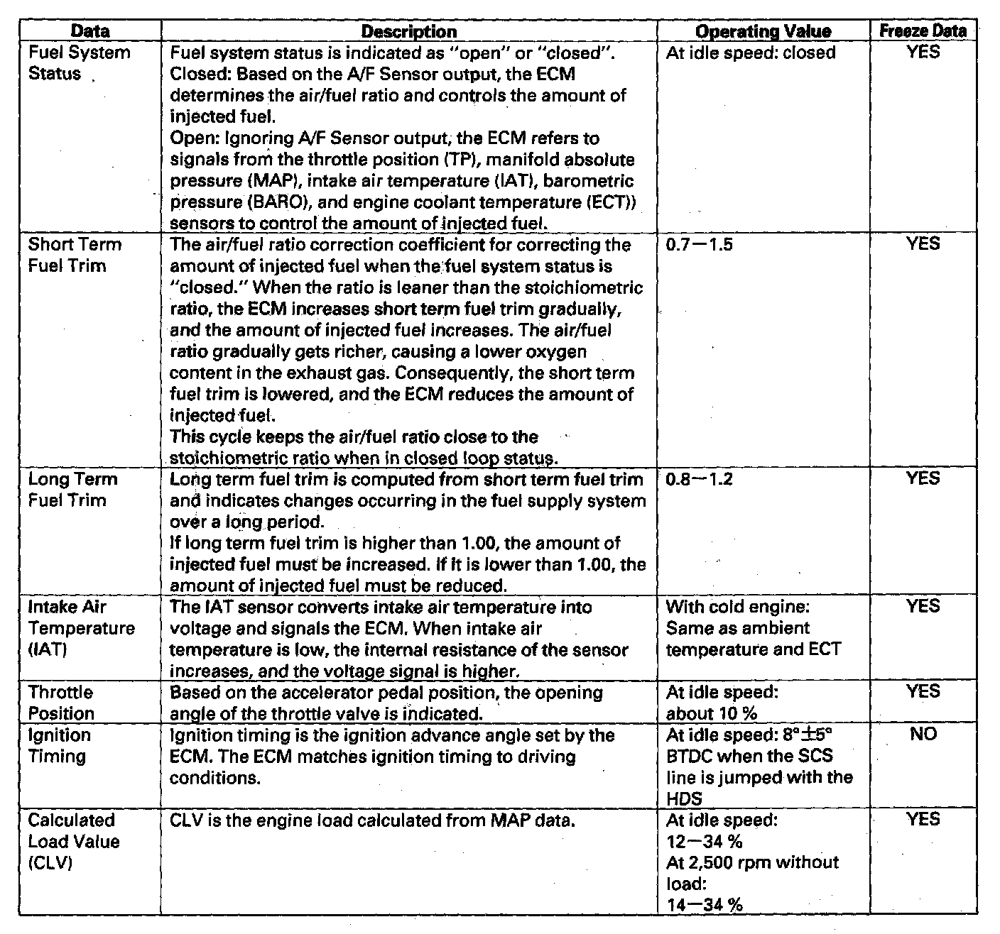 You can retrieve data from the ECM by connecting the HDS or a scan tool to the data link connector (DLC). The items listed in the table above conform to SAE recommended practice. The HDS also reads data beyond that recommended by SAE to help you find the causes of intermittent problems.