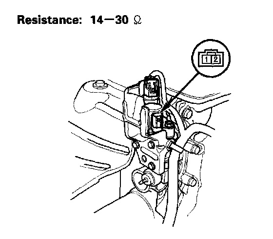 2. Measure resistance between VTEC solenoid valve connector terminals No.1 and No.2.