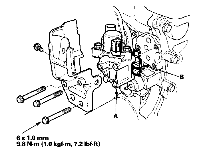 3. If the resistance is within specifications, remove the VTEC solenoid valve assembly (A) from the cylinder head, and check the VTEC solenoid valve filter (B) for clogging. If it is clogged, replace the solenoid valve filter, the engine oil filter, and the engine oil.