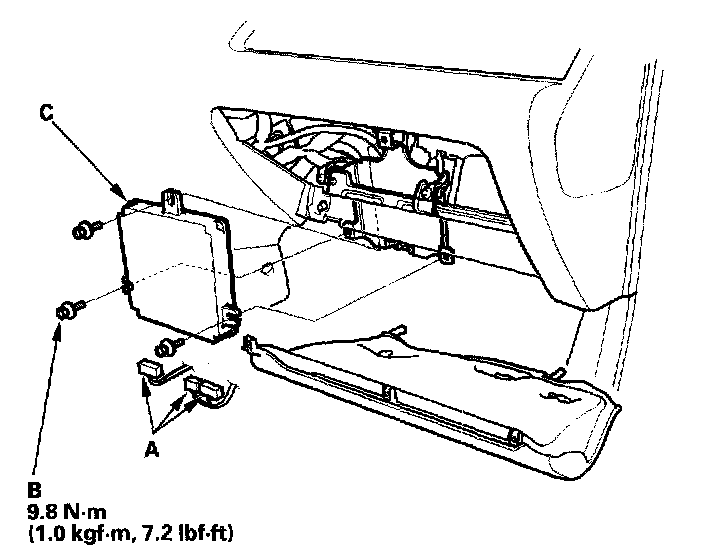 1. Remove the passenger's dashboard lower cover, the passenger's kick panel, and the glove box.