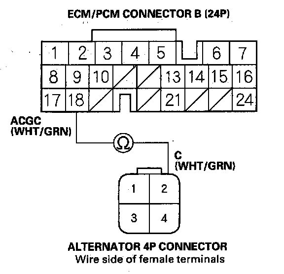 10. Check for continuity between ECM/PCM connector terminal B18 and alternator 4P connector terminal No. 2.
