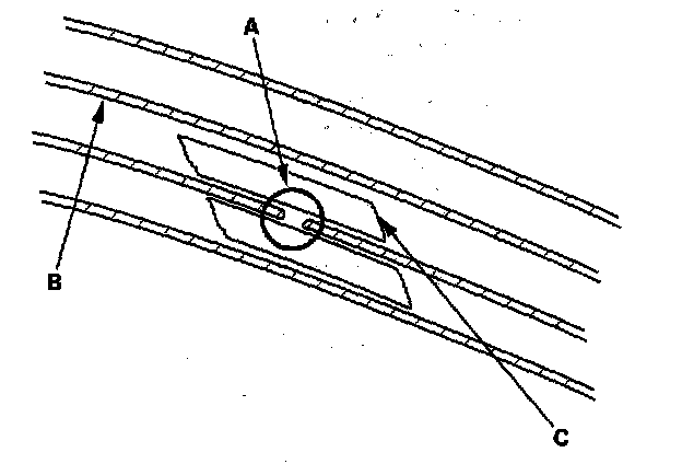 2. Carefully mask above and below the broken portion of the defogger wire (B) with transparent tape (C).