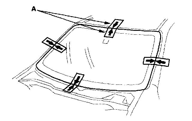 16. Set the windshield in the opening, and center it. Make alignment marks (A) across the windshield and body with a grease pencil at the four points shown. Be careful not to touch the windshield where adhesive will be applied.