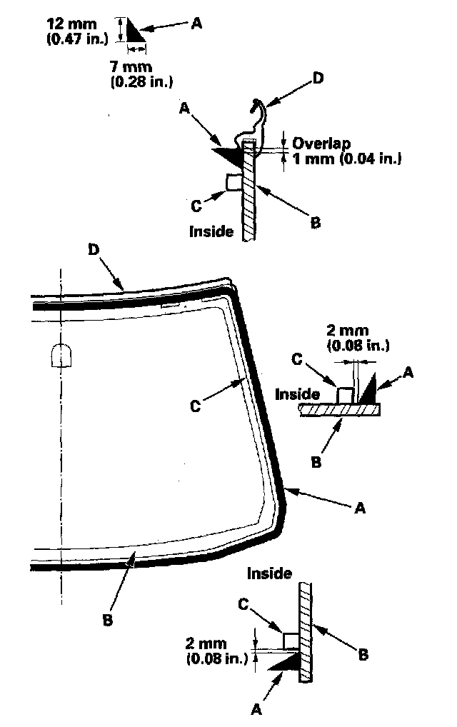 21. Put the cartridge in a caulking gun, and run a bead of adhesive (A) around the edge of the windshield (B) between the dams(C) and molding (D) as shown. Apply the adhesive within 30 minutes after applying the glass primer. Make a slightly thicker bead at each corner.