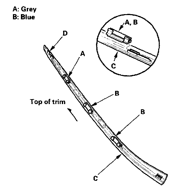 26. Install the clips (A, B) on both side trim pieces (C). If the clip (0) is damaged, replace the side trim and clips as an assembly.
