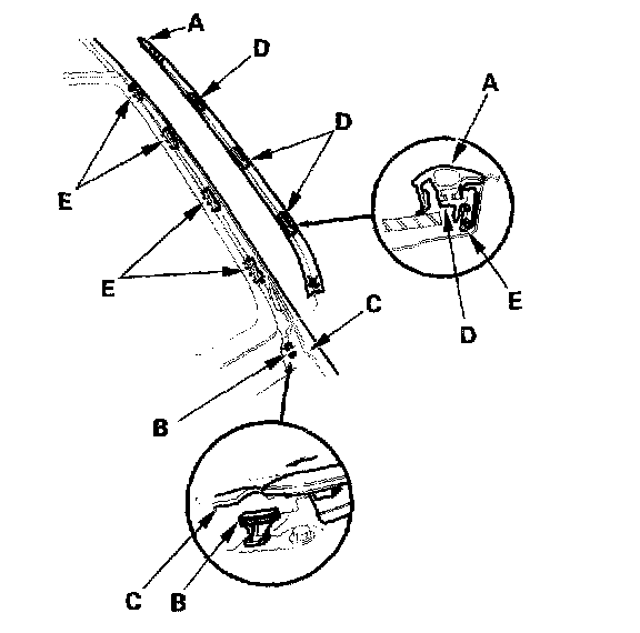 27. On both sides of the windshield, install the side trim (A) on the clip (B), then set the bottom edge of the side trim over the cowl cover (C), and align the clips (0) with the retainers (E), and push on the clips until the trim is fully seated on the windshield.