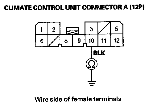 7. Check for continuity between the No. 10 terminal of climate control unit connector A (12P) and body ground.