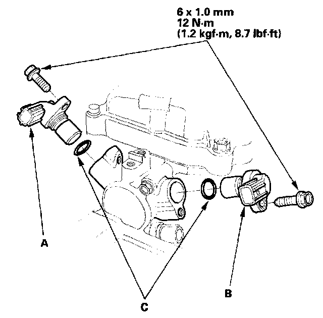 2. Install the CMP sensor A and the CMP sensor B with new O-rings (C).