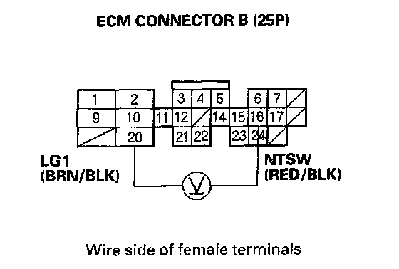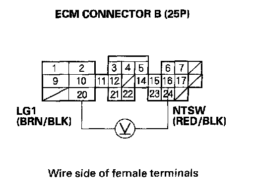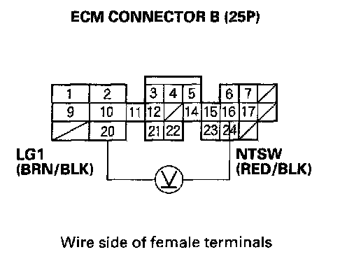 5. Measure voltage between ECM connector terminals B16 and B20.