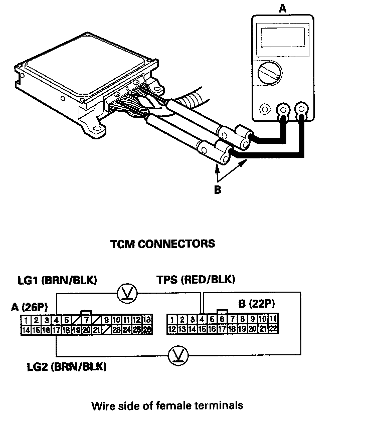 7. Connect a digital multimeter (A) and the special tools (B) to check voltage between TCM connector terminals B4 and A4 or A17.