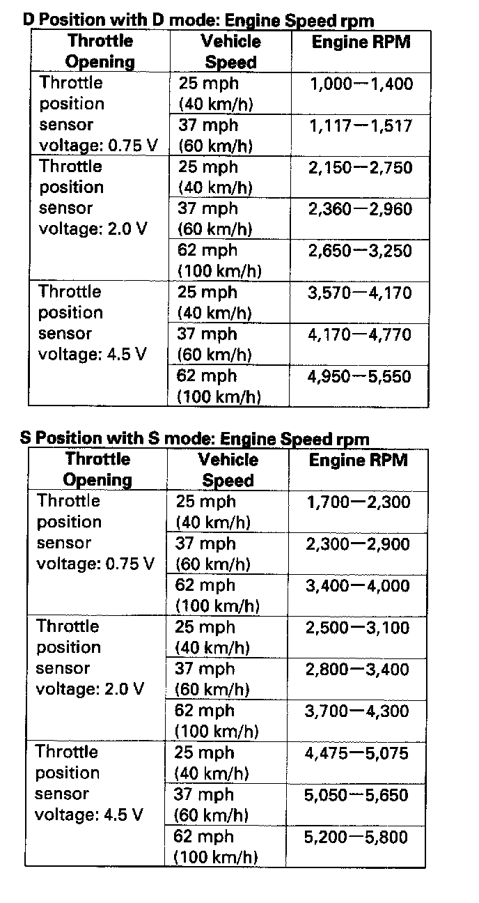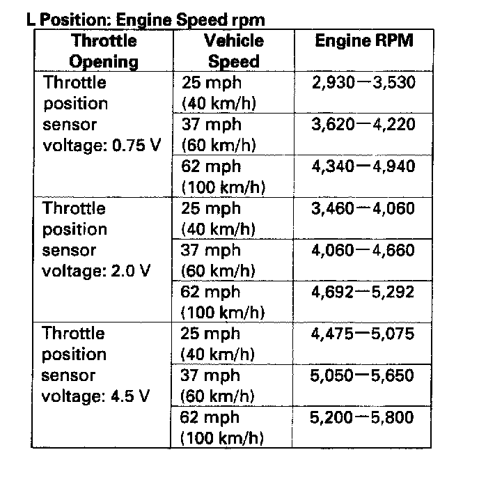 8. Test-drive the vehicle on a flat road in the position shown. While driving, check that the engine speeds meet the approximate vehicle speeds shown in the table.