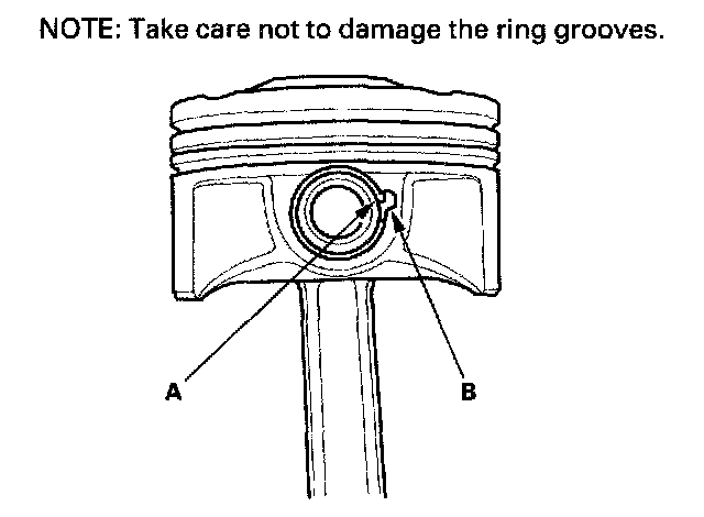 2. Apply new engine oil to the piston pin snap rings (A), and turn them in the ring grooves until the end gaps are lined up with the cutouts in the piston pin bores (B).