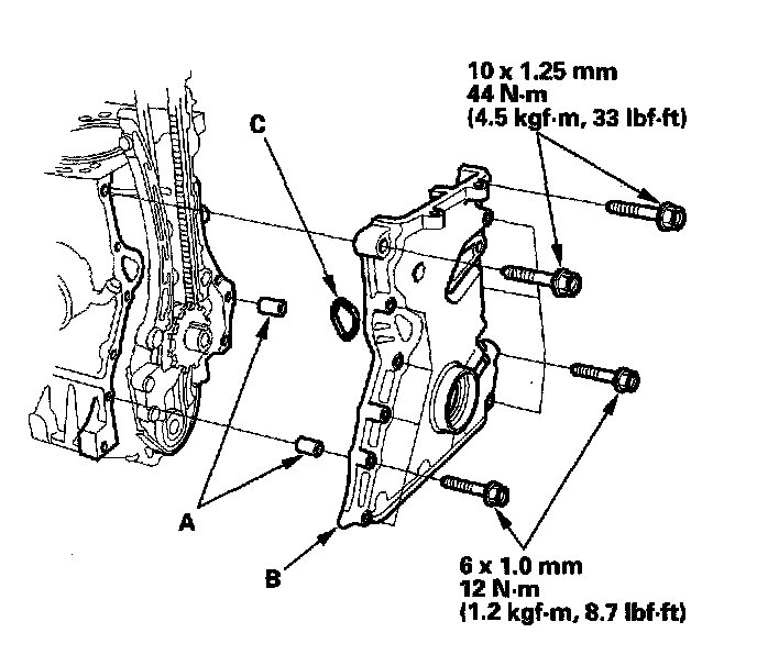 7. Install the dowel pins (A) and chain case (B) using a new O-ring (C).