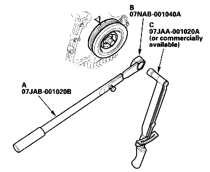 1. Set the crankshaft sprocket so that the No.1 Piston is at Top Dead Center (TDC). Align the key (A) on the sprocket and crankshaft with the pointer (B) on the engine block.