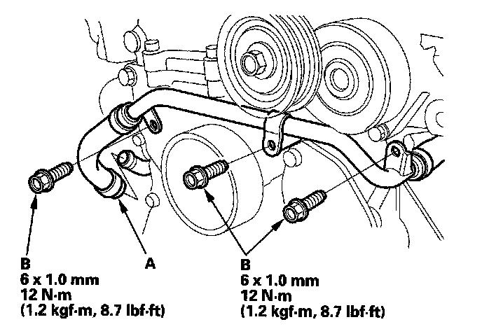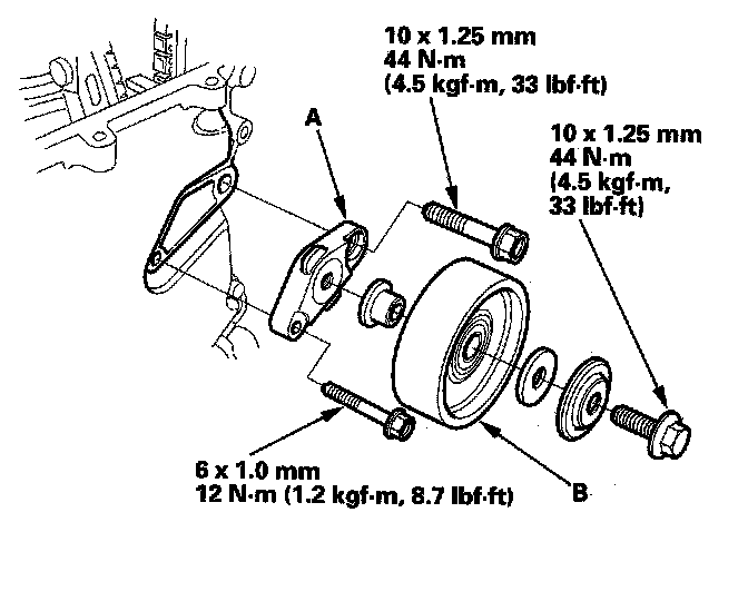 55. Install the idler pulley base (A), then install the idler pulley (B).