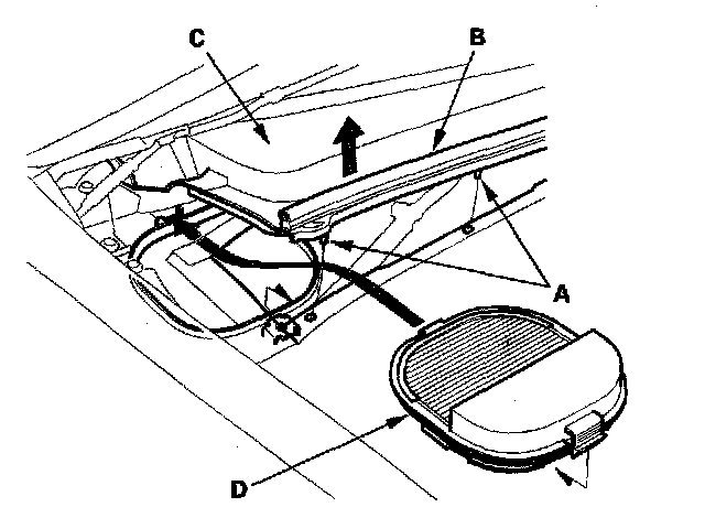 2. Remove the clips (A) and the hood seat (B). Lift the right side of the cowl cover (C) up, and remove the dust and pollen filter (D) as shown. Be careful not to damage the hood seal when removing the clips.