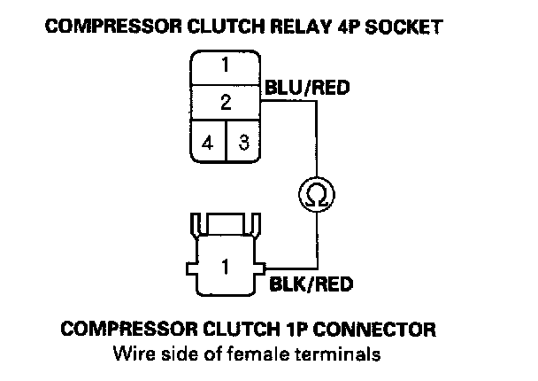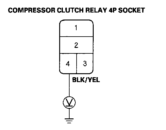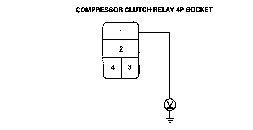 16. Check for continuity between the No.2 terminal of the compressor clutch relay 4P socket and the No.1 terminal of the compressor clutch 1P connector.