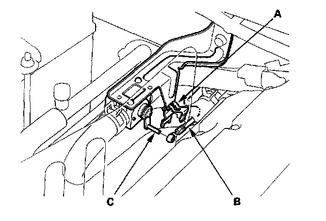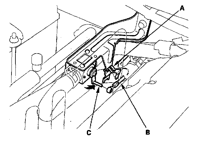 1. From under the hood, open the cable clamp (A), then disconnect the heater valve cable (B) from the heater valve arm (C).