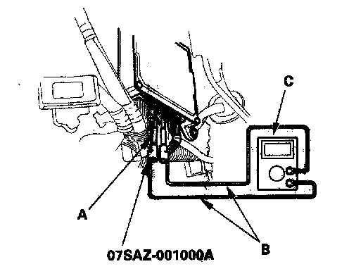 3. If you cannot get to the wire side of the connector or the wire side is sealed (A), disconnect the connector and touch the tester probe (B) to terminals (C) from the terminal side. Do not force the probe into the connector.