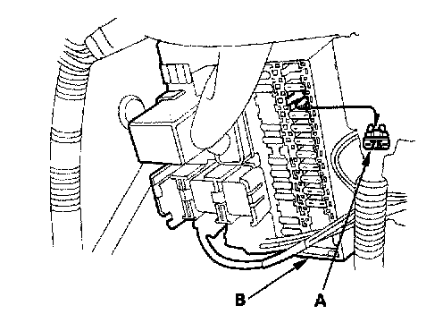 2. Remove the No. 25 BACK UP (7.5 A) fuse (A) from the under-dash fuse/relay box (B) for 60 seconds.