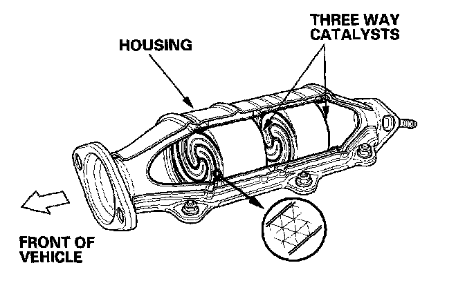 The TWC converts hydrocarbons (HC), carbon monoxide (CO), and oxides of nitrogen (NOx) in the exhaust gas to carbon dioxide (C02), nitrogen (N2), and water vapor.